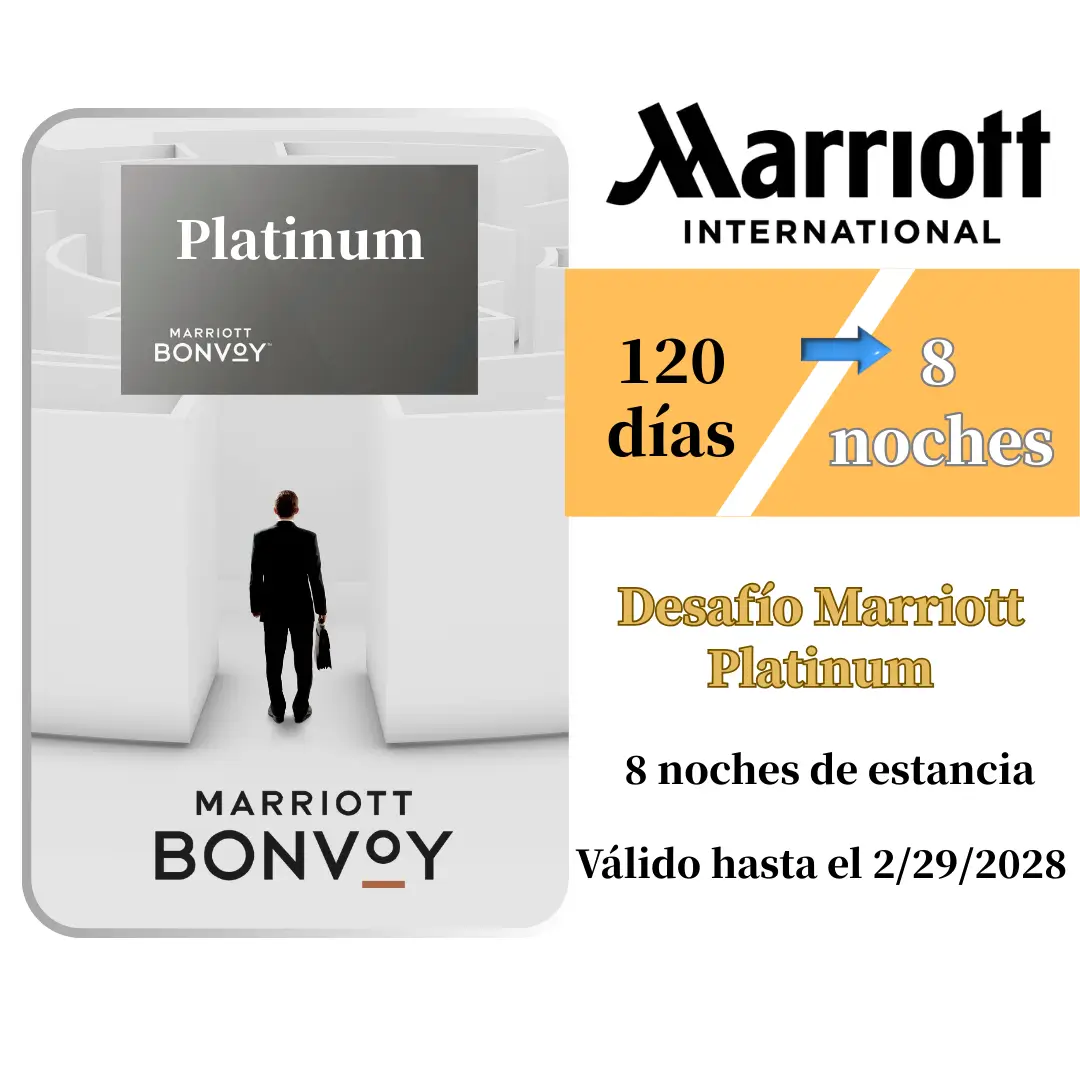 El Marriott Platinum Challenge es una vía de ascenso acelerado ofrecida oficialmente por Marriott. Solo necesitas completar 8 noches pagadas dentro de un periodo continuo de 120 días para subir directamente desde socio básico o Gold a Platinum Elite.