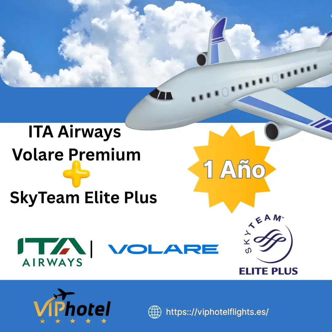 Con viphotelflights.es, puedes obtener 1 año completo de ITA Airways Volare Premium y SkyTeam Elite Plus al instante, sin necesidad de acumular millas ni cumplir requisitos de vuelos.